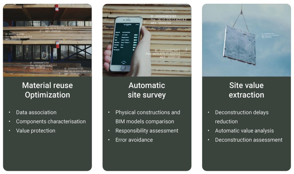 The RFID tags further serve as on-site digital interfaces to communicate data to Element’s platform, where workers, architects, engineers, decommissioners and contractors can follow the evolution of their material stocks with custom analysis and information according to their work environment. The digital environment created through Element’s methods is used to optimise construction procedures, site inspection, and second-hand design, creating value and economic incentive for the transition towards circular construction models.